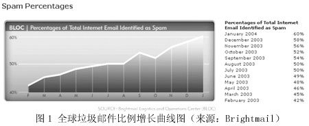 圖1來自著名的反垃圾郵件先鋒Brightmail公司的網(wǎng)站,顯示了最近12個月來,全球范圍內垃圾郵件在所有郵件中所占比例的增長曲線圖。按Brightmail的統(tǒng)計結果,2003年3月,垃圾郵件在全球郵件總量中的比例是45%,其后的一年間,平均每個月增長兩個百分點。到了今年2月,這個比例已經(jīng)達到62%,也就是說,現(xiàn)在全球每5封電子郵件中就有3封是有害無益的垃圾郵件。