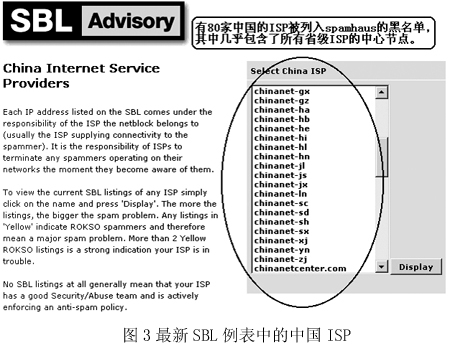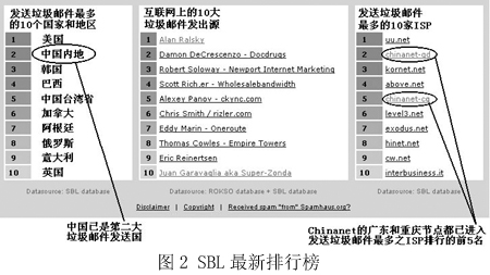 圖2是國際上著名的反垃圾郵件組織Spamhaus在網(wǎng)站上列出的統(tǒng)計排行榜,“China”已經(jīng)穩(wěn)居第二大垃圾郵件發(fā)送國的位置,而右邊的一個排行榜則從另一個角度向我國敲響了警鐘——在專為發(fā)送垃圾郵件的ISP所列的黑名單SBL中,我國Chinanet的兩個省級ISP在前10名中分列第2和第5名。而Chinanet作為中國的公用信息互聯(lián)網(wǎng)絡,是我國的Internet骨干網(wǎng),是國內用戶接入互聯(lián)網(wǎng)的主要途徑之一!拔覀冋娌幌M赃@樣的方式‘揚名海外’”,來自一家ISP的一位不肯透露姓名的女士說,“其實我們也是受害者!”