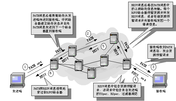 Int-Serv/RSVP服務模型在IETF RFC1633中進行了定義。RFC1633將資源預留協(xié)議RSVP作為IntServ結(jié)構(gòu)中的主要信令協(xié)議。其基本思想就在于以資源預留的方式來實現(xiàn)QoS保障,RSVP是其核心部分。RSVP是主機用來從應用程序獲得特定的QoS的一種控制協(xié)議,完成綜合服務需要定義的呼叫接納控制功能和資源預留功能。端點應用程序利用RSVP消息向網(wǎng)絡提出完成數(shù)據(jù)傳送必須保留的網(wǎng)絡資源(如帶寬及緩沖區(qū)大小等),同時也確定沿傳送路徑的各個節(jié)點傳輸處理策略,從而對每個業(yè)務流實現(xiàn)逐個控制。