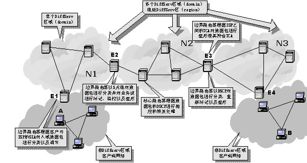 DiffServ區(qū)(region)則是由連續(xù)的DS區(qū)域構(gòu)成。一個DS區(qū)內(nèi)的DS區(qū)域可以支持不同的PHB組,并且各自區(qū)域的DSCP到PHB的映射函數(shù)也可能不相同。在不同的DS區(qū)域之間,必須對SLA和TCA進行調(diào)節(jié),以協(xié)調(diào)彼此之間的服務語義。這樣,通過在上游DS區(qū)域和下游DS區(qū)域之間建立SLA或TCA,區(qū)分服務可以擴展到多個DS區(qū)域。