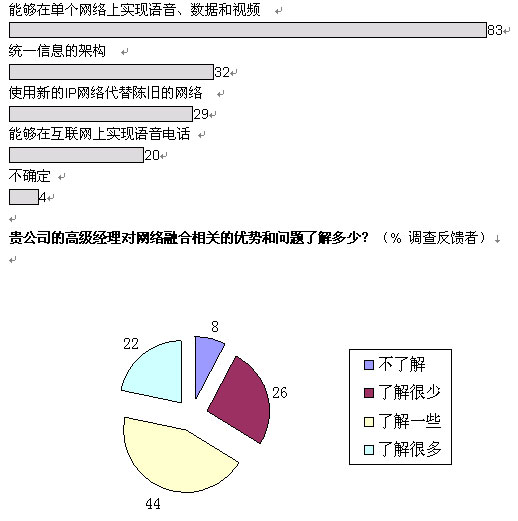 從更為廣泛的層面上看,我們的調(diào)查結(jié)果顯示:三分之一的管理人員對融合網(wǎng)絡(luò)的益處一無所知或者知之甚少。困惑的并不僅是高級經(jīng)理們:分析公司IDC近期對歐洲600余名廣域網(wǎng)管理人員進(jìn)行的調(diào)查顯示,只有五分之一的人能夠完全了解融合網(wǎng)絡(luò)所實(shí)現(xiàn)的各項(xiàng)功能。