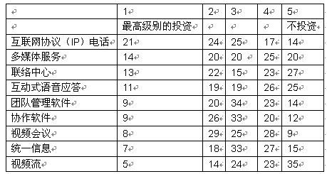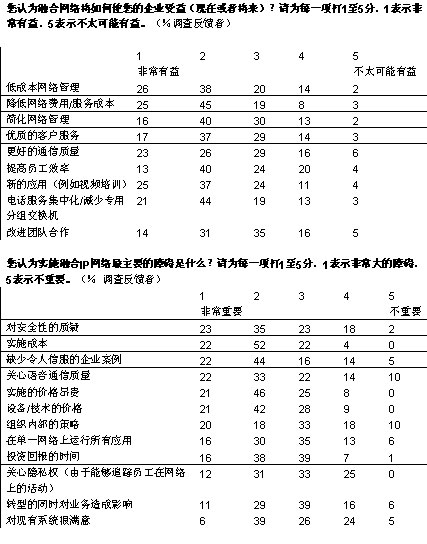 我們調(diào)查的企業(yè)中,有超過三分之二將在未來五年內(nèi)實(shí)現(xiàn)大多數(shù)或者所有部門向融合網(wǎng)絡(luò)的轉(zhuǎn)型。大部分企業(yè)采取按部就班的形式在某些特殊部門和業(yè)務(wù)開始部署。在融合應(yīng)用中,IP語音電話將在未來三年內(nèi)吸引大量投資;管理人士期望通過大幅削減公司內(nèi)部的通話費(fèi)用獲得早期的回報(bào)。在更廣泛的層面上,大多數(shù)管理者預(yù)計(jì),融合網(wǎng)絡(luò)對其企業(yè)的商業(yè)影響將會“非常重要”或者“重要”。
