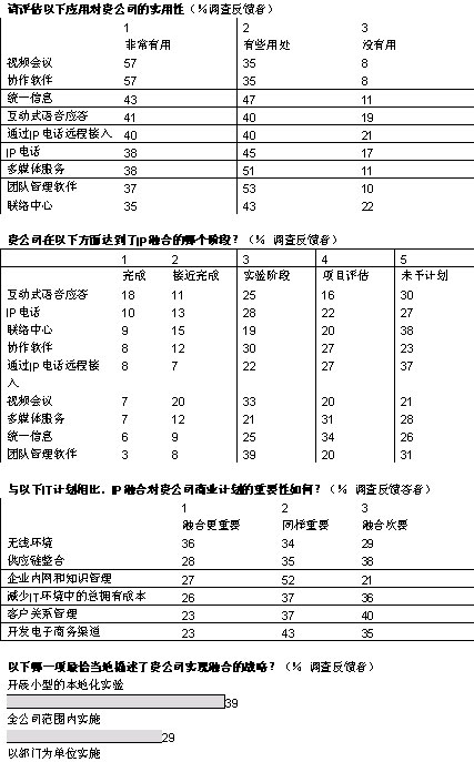 融合網(wǎng)絡(luò)已經(jīng)成為現(xiàn)實(shí)。在經(jīng)濟(jì)學(xué)家信息部展開的全球調(diào)查中,103位高級經(jīng)理中超過半數(shù)的人投票表示,他們的企業(yè)已經(jīng)開始實(shí)施IP網(wǎng)絡(luò)融合,還有26%表示他們將計(jì)劃部署。