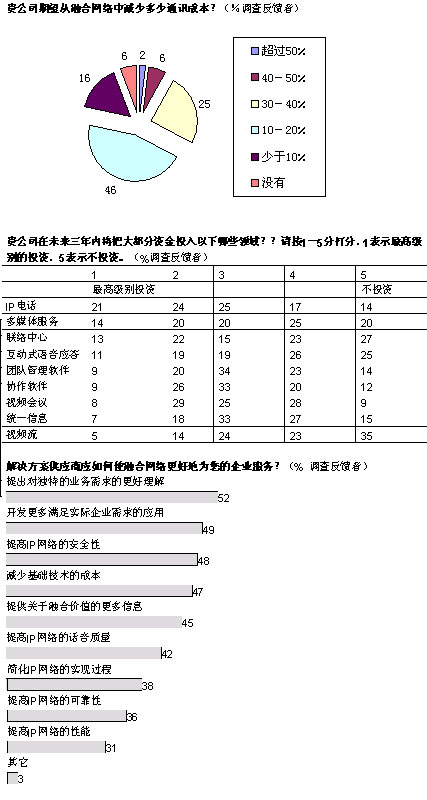 盡管如此,雖然IP融合的真正長期效益可能有利于提高員工效率,但是投資必須得到公司首席財(cái)務(wù)官的認(rèn)可。在總體網(wǎng)絡(luò)成本中預(yù)計(jì)可以節(jié)約多少?大多數(shù)公司希望削減10%-20%的費(fèi)用,也有相當(dāng)一部分公司期望減少30%-40%的費(fèi)用。上述報(bào)告中提到的實(shí)例中表明,這樣的節(jié)約是可以實(shí)現(xiàn)的。