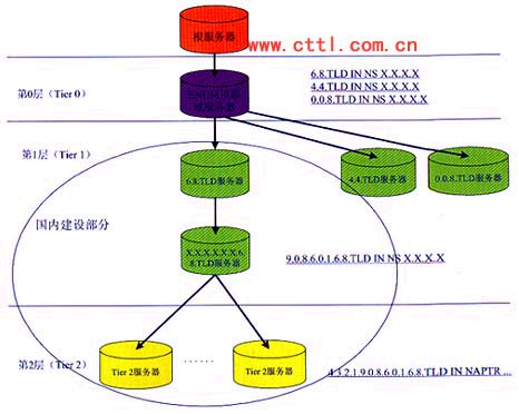 (1)第0層對應(yīng)于ENUM的根域,在這一層中只有一個(gè)域,比如e164.tld。第0層的域名服務(wù)器中包含的記錄指向ENUM第1層的域名服務(wù)器。
