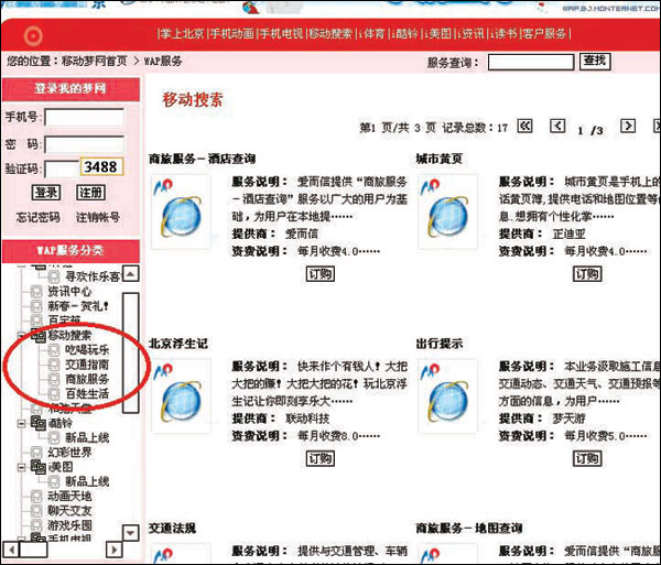 圖1 移動(dòng)運(yùn)營商網(wǎng)站上列出的移動(dòng)搜索業(yè)務(wù)分類