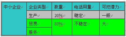 為什么大型企業(yè)可挖潛力小呢,因?yàn)榇笮推髽I(yè)的電話支出非常大,以至于被列入成本,可計(jì)算的成本,如何降低成本是大型企業(yè)要考慮的。