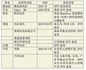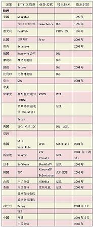 1999年,英國(guó)Video Networks公司率先在全球推出了IPTV業(yè)務(wù),此后,國(guó)外許多電信運(yùn)營(yíng)商先后進(jìn)入IPTV市場(chǎng)。但在2004年之前,多數(shù)運(yùn)營(yíng)商僅側(cè)重于IPTV的試驗(yàn),2004年后,IPTV開(kāi)始從試驗(yàn)階段向商用階段轉(zhuǎn)變,許多業(yè)界人士認(rèn)為,2005年將成為IPTV年。