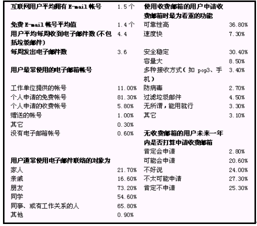 根據(jù)中國(guó)互聯(lián)網(wǎng)信息中心的調(diào)查顯示,中國(guó)現(xiàn)有9400萬(wàn)互聯(lián)網(wǎng)用戶, 用戶最經(jīng)常使用的網(wǎng)絡(luò)服務(wù)和功能是電子郵箱:占85.6%。