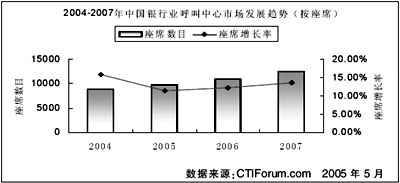 根據(jù)CTI論壇預測,到2007年,銀行業(yè)呼叫中心的座席總數(shù)將達到12500個,累計投資額將達到70億元。2005年到2007年的投資額復合年平均增長率為14.86%。未來,銀行業(yè)在未來三年內的發(fā)展穩(wěn)定,并以較高速度增長。