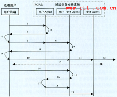 在POP點(diǎn)處,每類業(yè)務(wù)有一個(gè)“業(yè)務(wù)Agent”,其生命周期與運(yùn)營商此類業(yè)務(wù)的生命周期相同,即從運(yùn)營商開通此類業(yè)務(wù)到運(yùn)營商終止提供此類業(yè)務(wù)為止,因此“業(yè)務(wù)Agent”基本上是長期存在的!皹I(yè)務(wù)Agent”負(fù)責(zé)對不同用戶的同類業(yè)務(wù)進(jìn)行匯聚,統(tǒng)一與遠(yuǎn)端的“業(yè)務(wù)Agent”進(jìn)行業(yè)務(wù)交互。