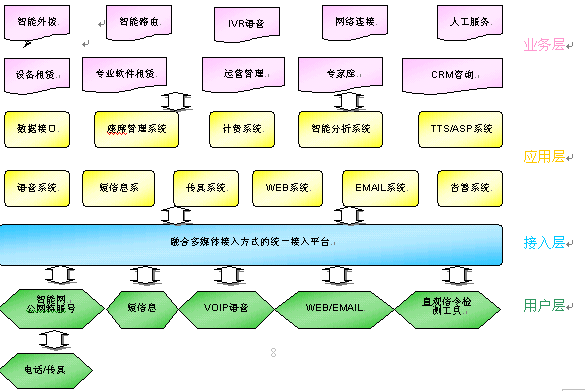 中心系統(tǒng)具備網(wǎng)絡(luò)呼叫中心及靈活的設(shè)備組網(wǎng)方式,必須使用多種媒體結(jié)合技術(shù),平臺(tái)能智能處理來(lái)自不同媒體的服務(wù)請(qǐng)求。多媒體包含了固定電話(huà)、移動(dòng)電話(huà)、傳真、尋呼、短消息、Web、Email、視頻、PDA等多媒體。
