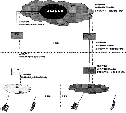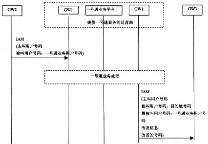 在圖1中,運(yùn)營商2的用戶撥叫運(yùn)營商1的一號通業(yè)務(wù)用戶號碼時(shí),呼叫將通過運(yùn)營商2的網(wǎng)關(guān)(GW2)、運(yùn)營商1的網(wǎng)關(guān)(GW1)接續(xù)到運(yùn)營商1的一號通業(yè)務(wù)平臺中。一號通業(yè)務(wù)平臺根據(jù)一號通業(yè)務(wù)用戶設(shè)置的接續(xù)規(guī)則,將呼叫翻譯到指定的目的地號碼。目的地號碼可能是運(yùn)營商1的用戶,也可能是其他運(yùn)營商的用戶。