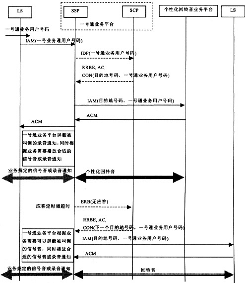 按照圖3所示的信令方式,一號通業(yè)務(wù)平臺屏蔽被叫側(cè)錄音通知后,如果被叫用戶申請了個性化回鈴音業(yè)務(wù),則會產(chǎn)生一號通業(yè)務(wù)與個性化回鈴音業(yè)務(wù)之間的互斥性,即如果一號通業(yè)務(wù)用戶所設(shè)定的目的地號碼申請了個性化回鈴音業(yè)務(wù),個性化回鈴音業(yè)務(wù)平臺給主叫用戶播放的錄音通知會被一號通業(yè)務(wù)平臺所屏蔽,主叫用戶將聽到由一號通業(yè)務(wù)平臺統(tǒng)一播放的信號音或錄音通知,而聽不到個性化回鈴音。以智能網(wǎng)實(shí)現(xiàn)、ISUP消息為例,具體的消息流程如圖4所示。