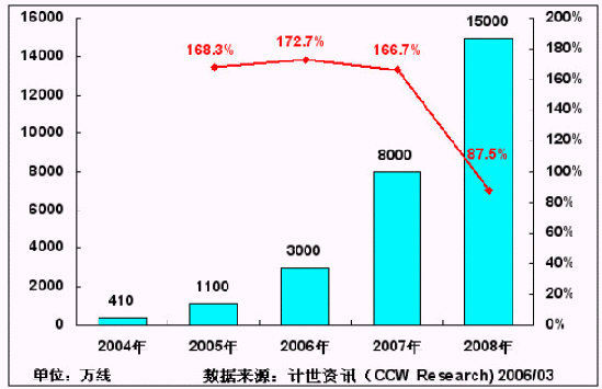 主流運(yùn)營商N(yùn)GN網(wǎng)絡(luò)的規(guī);ㄔO(shè),為IP Centrex、寬帶電話等新業(yè)務(wù)在國內(nèi)的大規(guī)模應(yīng)用提供了良好的支撐。計世資訊(CCW Research)預(yù)計,在未來3年內(nèi),中國的NGN網(wǎng)絡(luò)建設(shè)規(guī)模將獲得快速增長,到2008年,將有望達(dá)到1.5億線的規(guī)模。