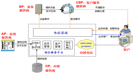 中國電信:綜合信息服務(wù)提供商,提供品牌、平臺(tái)、接入和渠道,負(fù)責(zé)業(yè)務(wù)的組織、運(yùn)營、銷售和管理,并為客戶提供統(tǒng)一的服務(wù)界面。