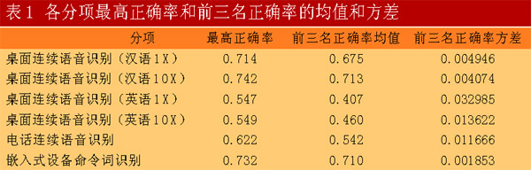 從各分項(xiàng)前三名的正確率方差可以看出,漢語桌面連續(xù)語音識(shí)別和嵌入式設(shè)備命令詞分項(xiàng)中各系統(tǒng)的性能差異較小,而英語桌面連續(xù)語音識(shí)別,特別是一倍實(shí)時(shí)任務(wù)中各系統(tǒng)性能差異較大。這是因?yàn)楫?dāng)前語音識(shí)別的研究重點(diǎn)在于前者,研究者較多,研究也比較深入,而英語的識(shí)別相對(duì)來說研究者較少。