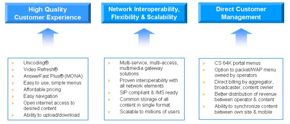 Refresh®和AnswerFast Plus® (MONA的一部分),同時多媒體網(wǎng)關(guān)解決方案也包括在內(nèi)。其它方面的可互操作性和用戶體驗改善問題很容易能解決,對今天現(xiàn)有的WAP服務是一種補充。