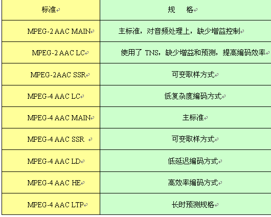 目前國際上對音頻處理技術上標準較多,在對下一代實時交互音頻處理上可以采用MPEG-1Layer2或AAC系列音頻,對選用標準的原則是,音頻頻響范圍要達到22KHz,這樣就幾乎可以覆蓋了人耳聽覺的全部范圍,甚至在高頻方面還有所超越,能夠使現(xiàn)場音頻得到真實自然的還原,并且在還原時可以采用雙聲道立體聲回放,使整個視頻通訊的聲音有更強的臨近感,達到CD級音質。同時在對鏈路帶寬的適應和編解碼效率上達到最佳。下表列出AAC的9種規(guī)格。