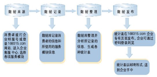 "企業(yè)客戶服務(wù)系統(tǒng)"統(tǒng)計數(shù)據(jù)分析功能,能幫助企業(yè)管理人員適時監(jiān)控"企業(yè)客戶服務(wù)系統(tǒng)"的運行情況,自動采集消費者在使用"企業(yè)客戶服務(wù)系統(tǒng)"過程的相關(guān)數(shù)據(jù),并分類整理成數(shù)據(jù)庫,為企業(yè)經(jīng)理人投資決策提供重要的數(shù)據(jù)支持。企業(yè)經(jīng)理人只需登陸客戶服務(wù)網(wǎng)站www.168315.com,按照"168315客戶服務(wù)中心"提供的用戶名和密碼登錄,即可隨時下載"企業(yè)客戶服務(wù)系統(tǒng)"的運行數(shù)據(jù),瀏覽客戶檔案庫。也可以由"中心"的服務(wù)人員將統(tǒng)計結(jié)果通過E-mail、傳真或郵寄的方式送到企業(yè)經(jīng)理人手中,如下圖: