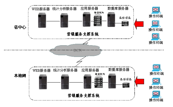 省中心/分公司營銷服務(wù)支撐系統(tǒng)由兩臺IBM服務(wù)器形成雙機(jī)集群,同時安裝有數(shù)據(jù)庫服務(wù)器、WEB服務(wù)器、應(yīng)用服務(wù)器、統(tǒng)計分析服務(wù)器。