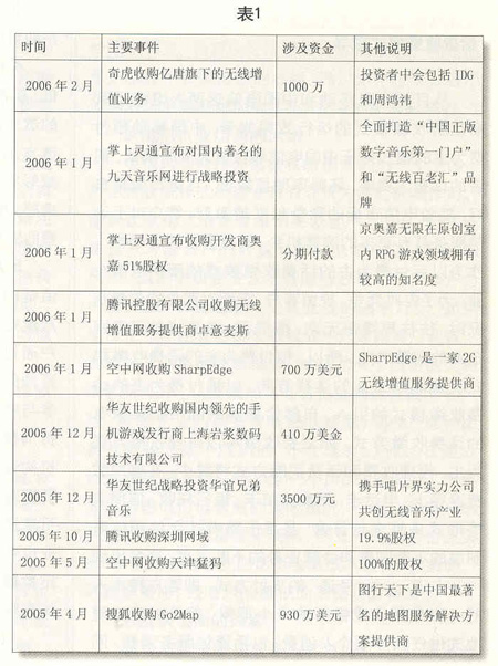 從2003年開始,國(guó)內(nèi)就顯現(xiàn)出并購(gòu)增值服務(wù)運(yùn)營(yíng)企業(yè)的苗頭。2004年以來,隨著整治增值服務(wù)運(yùn)營(yíng)企業(yè)的力度不斷加大,并購(gòu)漸成風(fēng)潮(見表1)。2004年2月,新浪收購(gòu)深圳網(wǎng)興科技公司;2004年5月,搜狐收購(gòu)手機(jī)WAP服務(wù)提供商北京吉菲爾公司。2005年,在“超級(jí)女生”節(jié)目大獲成功后,掌上靈通宣布將對(duì)國(guó)內(nèi)著名的九天音樂網(wǎng)進(jìn)行戰(zhàn)略投資,全面打造“中國(guó)正版數(shù)字音樂第一門戶”和“無線百老匯”品牌。各大移動(dòng)增值業(yè)務(wù)服務(wù)商通過并購(gòu)競(jìng)爭(zhēng)對(duì)手,門戶網(wǎng)站可以在移動(dòng)增值服務(wù)領(lǐng)域?qū)で笮碌耐黄,獲得可觀的利益,增強(qiáng)自身的競(jìng)爭(zhēng)力。伴隨著3G商用的日益臨近和市場(chǎng)競(jìng)爭(zhēng)的不斷加劇,主流SP(服務(wù)提供商)進(jìn)一步加快了資本購(gòu)并和業(yè)務(wù)整合的步伐,整個(gè)SP行業(yè)將加速洗牌。經(jīng)過市場(chǎng)整合,主流SP將不斷做大做強(qiáng),而相當(dāng)多的缺乏市場(chǎng)競(jìng)爭(zhēng)力的SP將被淘汰出局。
