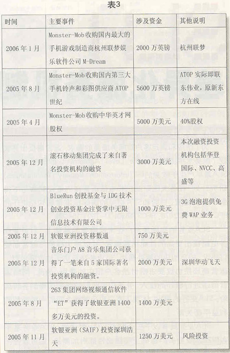 近幾年來,一些資本投資商將投資的重點(diǎn)放到了無線音樂、手機(jī)游戲和手機(jī)視訊等業(yè)務(wù)領(lǐng)域,逐步加大了對(duì)SP的投資力度(見表3)。進(jìn)入2005年以來,著眼于2.5G向3G的全面演進(jìn),風(fēng)險(xiǎn)投資對(duì)SP的投資力度進(jìn)一步加大。以滾石移動(dòng)為例,在2002年和2004年獲得兩輪風(fēng)險(xiǎn)投資之后,滾石移動(dòng)憑借在無線音樂領(lǐng)域取得的良好市場(chǎng)業(yè)績(jī),又獲得了智基創(chuàng)投、華登國(guó)際、聯(lián)想投資等公司的投資,投資金額達(dá)3000萬美元。繼2004年10月獲得IDG投資以后,2005年12月7日,國(guó)內(nèi)著名的數(shù)字音樂門戶——A8音樂集團(tuán)獲得了包括IDG和Intel投資公司在內(nèi)的5家國(guó)際著名投資機(jī)構(gòu)的投資,投資金額達(dá)2000萬美元。同月,掌中無限則獲得了來自全球性風(fēng)險(xiǎn)投資商BlueRun創(chuàng)投基金和IDG總額達(dá)上千萬美元的投資。