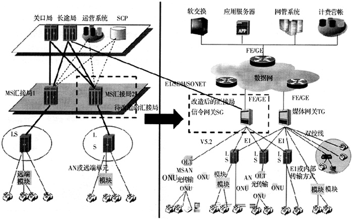 改造后的匯接局和端局之間通過(guò)ISUP中繼方式連接,接入網(wǎng)絡(luò)通過(guò)V5中繼接入。如果原有匯接局直接下掛部分用戶(hù),這部分用戶(hù)可以采用中繼媒體網(wǎng)關(guān)下掛接入單元的方式接入。原有端局用戶(hù)的數(shù)據(jù)管理和業(yè)務(wù)提供統(tǒng)一由軟交換支持,端局用戶(hù)的業(yè)務(wù)觸發(fā)提升到匯接局,避免對(duì)端局的改造,同時(shí),用戶(hù)可以使用軟交換業(yè)務(wù)平臺(tái)提供的各類(lèi)智能業(yè)務(wù)和增值業(yè)務(wù)。匯接局網(wǎng)絡(luò)優(yōu)化后,原有端局無(wú)法提供的業(yè)務(wù)均可以由軟交換業(yè)務(wù)系統(tǒng)提供。