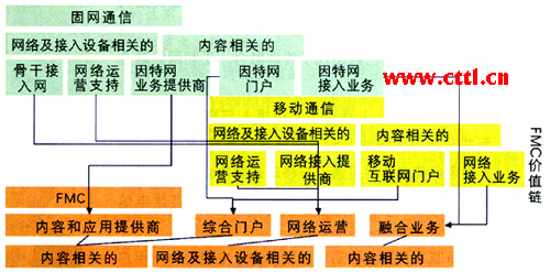總之,在FMC新配置的價(jià)值鏈中,應(yīng)用和內(nèi)容的作用非常重要,因?yàn)樗麄冊谌诤蠒r(shí)將價(jià)值鏈中的各個(gè)部分連接起來。因此,可以認(rèn)為內(nèi)容和應(yīng)用的建立、積累將會推動增值FMC業(yè)務(wù)的發(fā)展。今后隨著在內(nèi)容和業(yè)務(wù)領(lǐng)域?qū)⒊霈F(xiàn)更多不同的參與者,如內(nèi)容提供商、應(yīng)用提供商和中間件提供商,F(xiàn)MC價(jià)值鏈將進(jìn)一步得到更深層次的合作、擴(kuò)張和合并。這些在新的價(jià)值鏈中出現(xiàn)的更多獨(dú)立但又不同的實(shí)體,將直接反映FMC融合的特征。