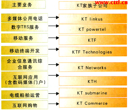 目前,KT集團(tuán)是全業(yè)務(wù)運(yùn)營商,同時(shí)也是韓國最大的固網(wǎng)運(yùn)營商,它在FMC領(lǐng)域最大動作就是BcN寬帶融合網(wǎng)絡(luò),這是韓國政府為確保韓國在IT和電信技術(shù)市場持續(xù)領(lǐng)先地位而實(shí)行的IT839計(jì)劃的核心環(huán)節(jié)之一。BcN目的是要將有線與無線系統(tǒng)、通信和廣播系統(tǒng)融合在一起,為企業(yè)用戶和個(gè)人用戶提供一個(gè)共同的渠道收發(fā)語音、文本、圖像和視頻文件。為此,KT集團(tuán)順著新的價(jià)值鏈,對集團(tuán)內(nèi)部分機(jī)構(gòu)的功能進(jìn)行了調(diào)整,其主要組織架構(gòu)如圖2所示: