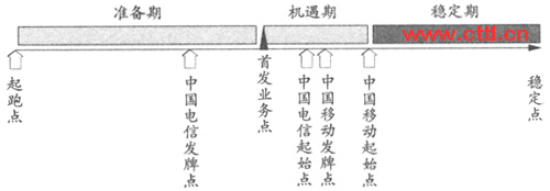 此版本是表示中國移動進(jìn)入3G業(yè)務(wù)運營早于競爭對手。圖4根據(jù)中國移動和中國電信發(fā)放牌照的不同時期而將全業(yè)務(wù)運營市場策略劃分成準(zhǔn)備期、機(jī)遇期和穩(wěn)定期。