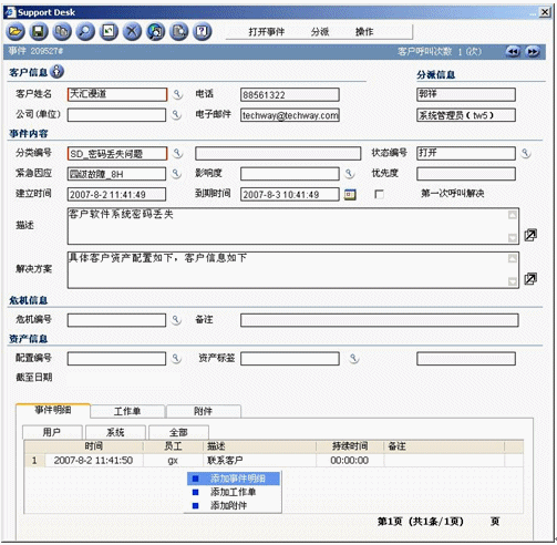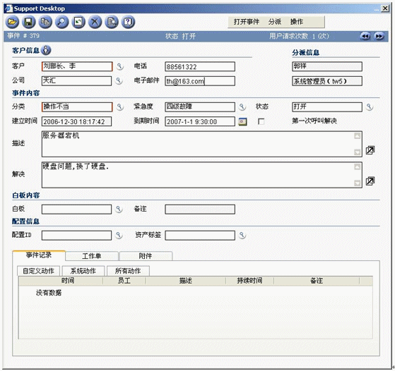事件記錄應該在某個服務臺工具中記錄和跟蹤,該工具最好是作為集成的服務管理工具集的構成部分。該工具應該在引發(fā)新的事件時提供最基本的事件記錄。比如為了幫助提高效率,當你在天匯幫助臺的用于記錄事件的事件窗口中輸入請求發(fā)起者的姓名時,利用客戶數(shù)據(jù)庫可以自動填充諸如位置、部門和聯(lián)系詳細信息等字段。天匯幫助臺還支持使用計算機電話集成