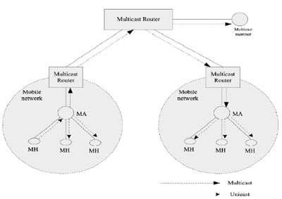 IETF的移動(dòng)IP協(xié)議定義了家鄉(xiāng)代理(home Agent,簡稱HA)、外地鏈路、外地代理(foreign Agent,簡稱FA)、通信對(duì)端等概念,一個(gè)移動(dòng)節(jié)點(diǎn)擁有兩個(gè)IP地址:家鄉(xiāng)地址和轉(zhuǎn)交地址。節(jié)點(diǎn)在移動(dòng)過程中,家鄉(xiāng)地址不改變,發(fā)送到該節(jié)點(diǎn)的數(shù)據(jù)都通過家鄉(xiāng)地址與轉(zhuǎn)交地址之間的隧道轉(zhuǎn)發(fā)給移動(dòng)節(jié)點(diǎn)。當(dāng)組成員切換時(shí),包括網(wǎng)絡(luò)鏈路間切換的固有時(shí)延,以及重新加入組播組以及建立組播轉(zhuǎn)發(fā)樹的時(shí)延,都將導(dǎo)致組播成員丟包。