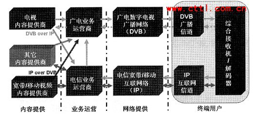從圖2中我們可以看出,IPTV實(shí)際上有電信和廣電兩條業(yè)務(wù)通道。其中,電信的業(yè)務(wù)通道是雙向的通道,而廣電的業(yè)務(wù)通道是單向的,電視內(nèi)容提供商可以利用DVBoverIP技術(shù)通過(guò)電信業(yè)務(wù)運(yùn)營(yíng)商來(lái)開(kāi)展IPTV業(yè)務(wù)。寬帶/移動(dòng)視頻內(nèi)容提供商也可以利用IPover