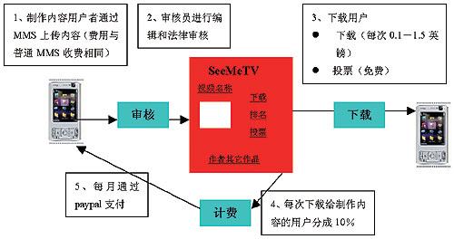 M1新加坡移動運(yùn)營商M1推出了用戶制作及共享視頻業(yè)務(wù)——MeTV,用戶可以通過MMS上傳視頻內(nèi)容,其它用戶可以瀏覽并下載。這項業(yè)務(wù)為用戶提供了一個展示自己和了解他人的平臺。這個業(yè)務(wù)也建立了與用戶分成的模式,用戶可以從自己上傳的內(nèi)容中獲得利潤。用戶上傳的視頻內(nèi)容,被他人下載一次,用戶就可以獲得0.05新元。自從2007年3月該業(yè)務(wù)推出以來,已經(jīng)有超過4萬名用戶,收入最高的用戶已經(jīng)達(dá)到50~100新元。