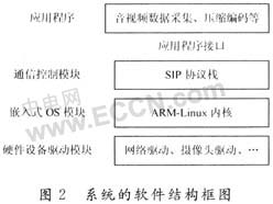在系統(tǒng)硬件完成后,剩下的需要大量丁作來編寫代碼實(shí)現(xiàn)各個(gè)功能模塊,最終實(shí)現(xiàn)整個(gè)系統(tǒng)。系統(tǒng)的軟件結(jié)構(gòu)如圖2所示。嵌入式OS是采用ARM-Linux內(nèi)核,硬件驅(qū)動模塊主要是基于ARM