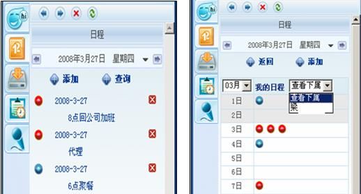 我們用過OUTLOOK的電子日程和手機自帶的日程功能都知道,電腦本機和手機實現(xiàn)日程管理都又各自很大的局限性,優(yōu)你客巧妙的實現(xiàn)了日程的網(wǎng)絡(luò)化管理并可以捆綁在手機提醒上,獨特又實用。其中紅綠日程各自代表工作和個人事務(wù),其中工作日程還能共享給上級。