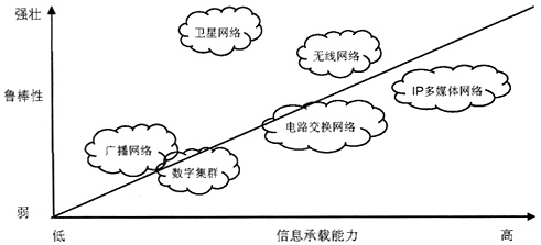 圖2 各種通信網(wǎng)絡(luò)的魯棒性和信息承載能力分析