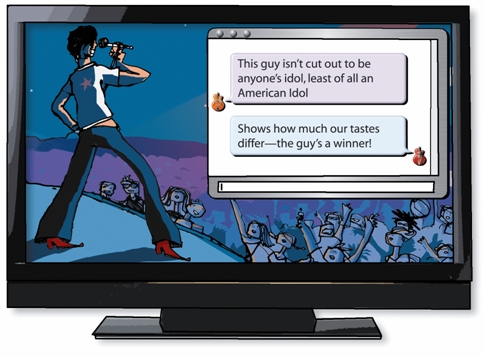 圖1:用戶可以一邊看“美國(guó)偶像”,一邊通過(guò)電視機(jī)向朋友發(fā)送短信,同時(shí)還研究最新競(jìng)爭(zhēng)對(duì)手的背景。