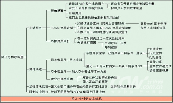 在給某移動運營商進(jìn)行的接通率優(yōu)化咨詢項目中,利用呼叫中心接通率優(yōu)化模型進(jìn)行了分析,圖2是針對分流呼叫中心總體呼叫量所提出的建議措施。