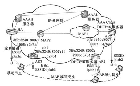 分別在MN上啟動HMIPv6程序,在HA上啟動HMIPv6程序和DHCPv6服務器程序,在AR1、AR2和AR3上啟動DHCPv6服務器端程序和路由通告協(xié)議。在服務器上啟動AAA服務器端程序。通過手動修改ESSID在家鄉(xiāng)與不同的MAP域之間進行切換,完成在切換過程的接入認證過程。
