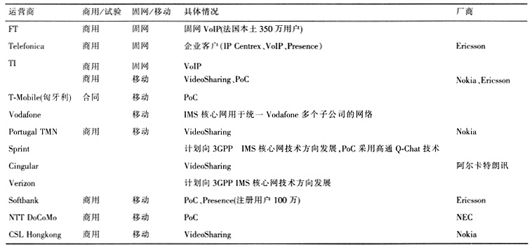 - IMS業(yè)務(wù)國(guó)外應(yīng)用仍然處于發(fā)展初期。表現(xiàn)為:以零散的個(gè)別應(yīng)用為主,尚未形成大規(guī)模發(fā)展局面;以基本業(yè)務(wù)的應(yīng)用為主,IMS多業(yè)務(wù)綜合、基于IMS業(yè)務(wù)能力的信息內(nèi)容應(yīng)用和企業(yè)行業(yè)應(yīng)用尚不成熟。