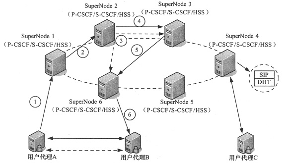 。3)在SuperNode2上,SuperNode2能夠識(shí)別會(huì)話請(qǐng)求為自己所控制的用戶的會(huì)話請(qǐng)求,執(zhí)行S-CSCF功能,完成業(yè)務(wù)的觸發(fā)和控制。在執(zhí)行S-CSCF功能之后,SuperNode3向基于DHT的HSS功能請(qǐng)求被叫用戶的S-CSCF功能所在的位置。