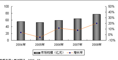 圖1 2004-2008年中國電信運(yùn)營支撐系統(tǒng)市場規(guī)模及增長