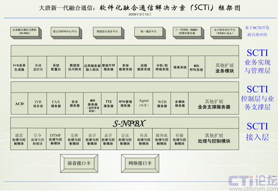 案例:我與大唐中聯(lián)(大唐融合)、和創(chuàng)世紀、華夏成訊等公司的技術開發(fā)人員經(jīng)過幾年來的摸索與實踐開發(fā),提出軟件化融合通信解決方案(SCTI)。通過計算機的軟件(通信服務系統(tǒng))來實現(xiàn)交換機上的所有通信功能,在互聯(lián)網(wǎng)上實現(xiàn)所有傳統(tǒng)通信網(wǎng)上的所有功能、還實現(xiàn)互聯(lián)網(wǎng)上的新的通信功能,在與傳統(tǒng)通信網(wǎng)上相連,只需增加一塊語音接口卡,就能實現(xiàn)互聯(lián)網(wǎng)與傳統(tǒng)通信的統(tǒng)一。此方案的成本比統(tǒng)一通信、融合通信等解決方案的成本要降幾十倍到上百倍。