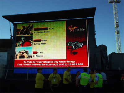 比如,某些公司可能會(huì)使用上面所述的調(diào)節(jié)型文本信息收發(fā)方式來(lái)顯示滾動(dòng)的帶狀區(qū)內(nèi)容,但也會(huì)在文本顯示的過(guò)程中覆蓋某張由手機(jī)用戶拍攝的圖象。這張圖片一般可能是該用戶的貓或狗,然后加上一些有趣的元素。在戶外活動(dòng)中,我們可以用拍到的圖象來(lái)加強(qiáng)文本信息。比如,活動(dòng)現(xiàn)場(chǎng)可以就屏幕上的一張照片提問“他夠不夠火辣?”。這樣的問答結(jié)果隨后就可以被實(shí)時(shí)廣播到屏幕上。