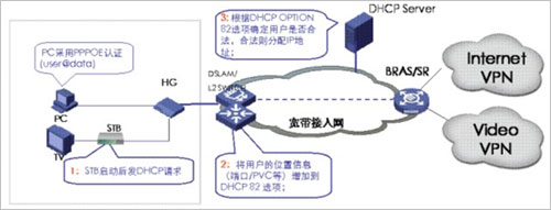 當(dāng)網(wǎng)絡(luò)設(shè)備收到STB的DHCP請求報(bào)文時,需要在報(bào)文后添加OPTION82字段,此時有兩種模式進(jìn)行DHCP+認(rèn)證,一種是直接把DHCP報(bào)文送給DHCP服務(wù)器,由DHCP服務(wù)器根據(jù)OPT82字段來判斷該用戶是否為合法用戶,從而決定是否為其分配IP地址。另一種是DHCP報(bào)文先送到BRAS,由BRAS將OPT82字段放到RADIUS的一個子域里,通過RADIUS服務(wù)器來進(jìn)行用戶合法性認(rèn)證,若用戶合法,再由DHCP服務(wù)器分配IP地址。