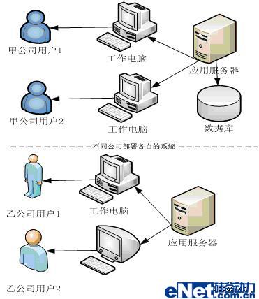 傳統(tǒng)軟件是在公司內部架設軟件運行環(huán)境,自己購買應用服務器、數(shù)據(jù)庫服務器、網(wǎng)卡等硬件,安裝自己的局域網(wǎng)并在局域網(wǎng)內部署軟件。所以不同公司都各自部署一套自己的系統(tǒng)。不同公司的用戶事實是通過不同的途徑訪問不同的系統(tǒng),如圖2所示:
