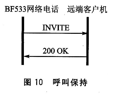 BF533網(wǎng)絡(luò)電話遠(yuǎn)端客戶機(jī)遠(yuǎn)端各尸機(jī)回復(fù)200 0K接受保持,如圖10所示。同理,呼叫恢復(fù)就是將c參數(shù)恢復(fù)原值,過程與呼叫保持相同。