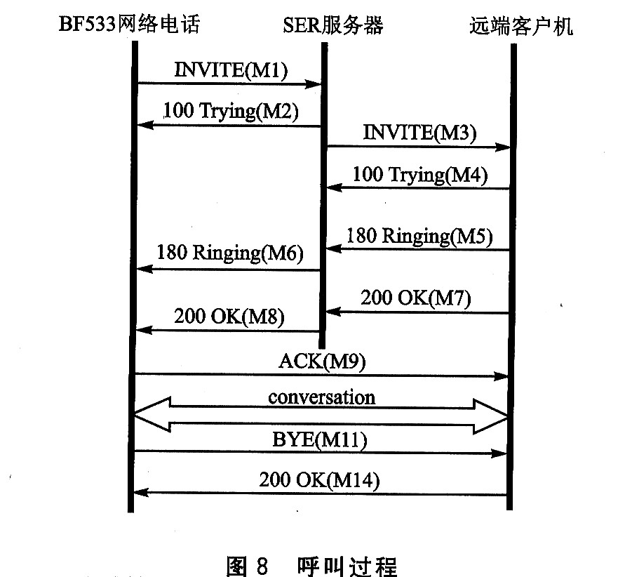 呼叫過程如圖8所示。BF533網(wǎng)絡(luò)電話(BP)先是向SER服務(wù)器發(fā)送了一條INⅥTE消息(M1),要求與遠(yuǎn)端客戶機(jī)(RC)進(jìn)行對話。SER馬上回復(fù)一條100